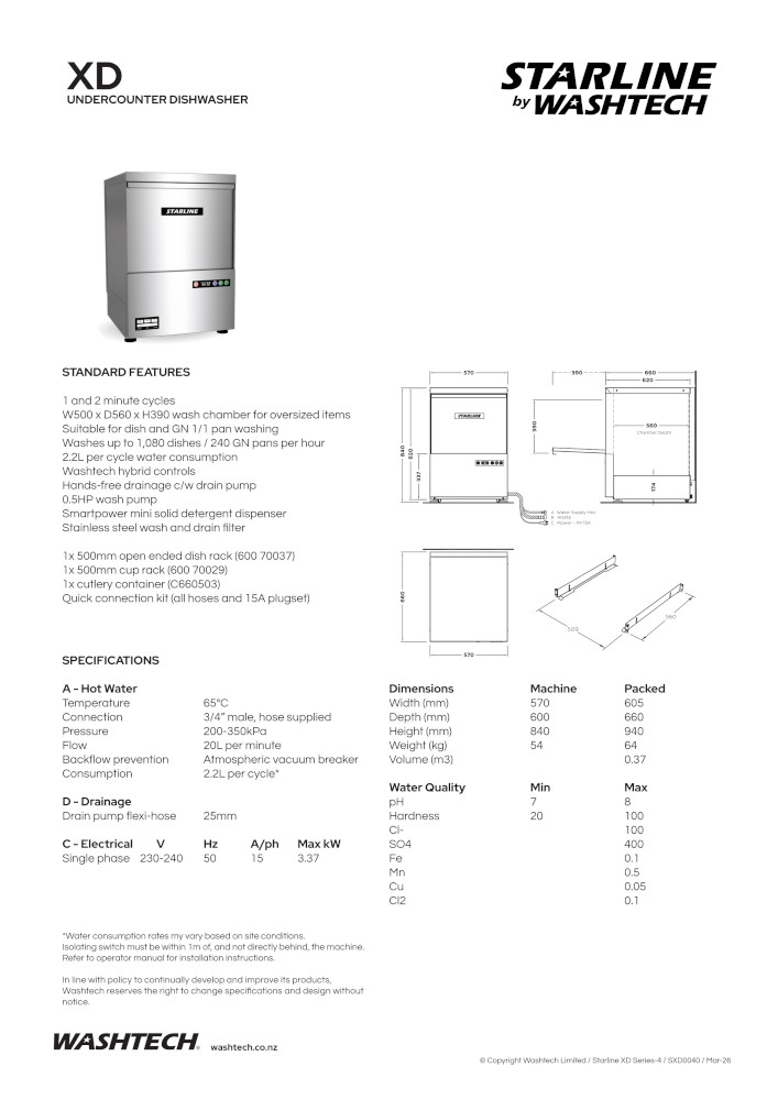 STARLINE XD UNDERCOUNTER DISHWASHER WITH DRAIN PUMP